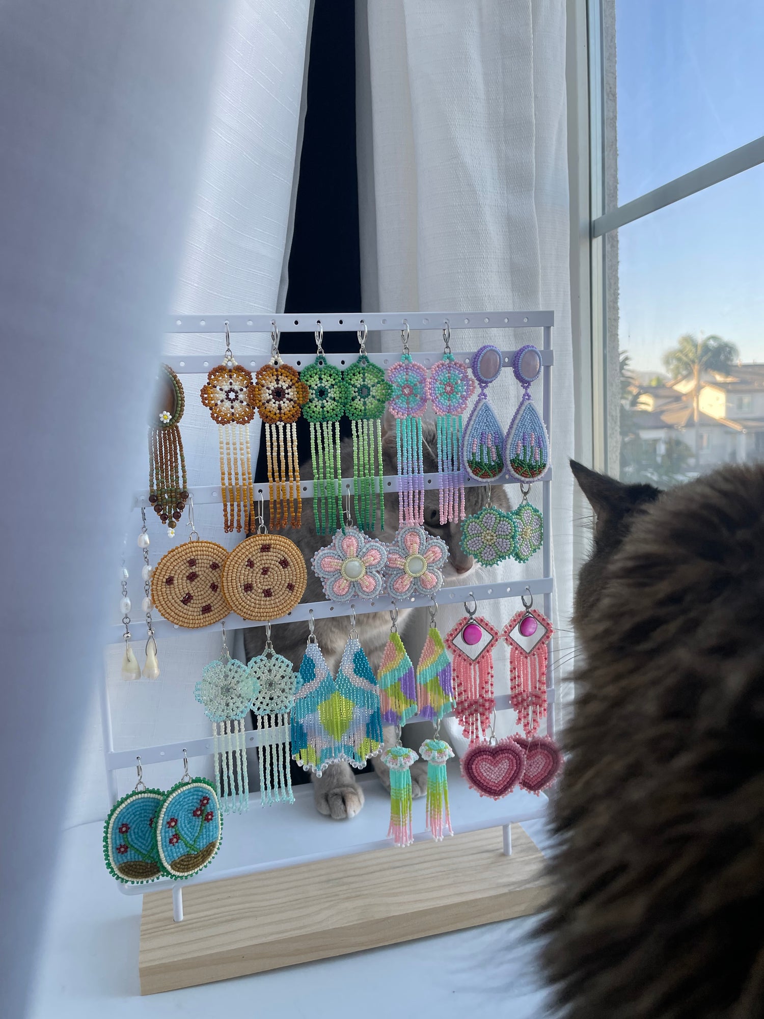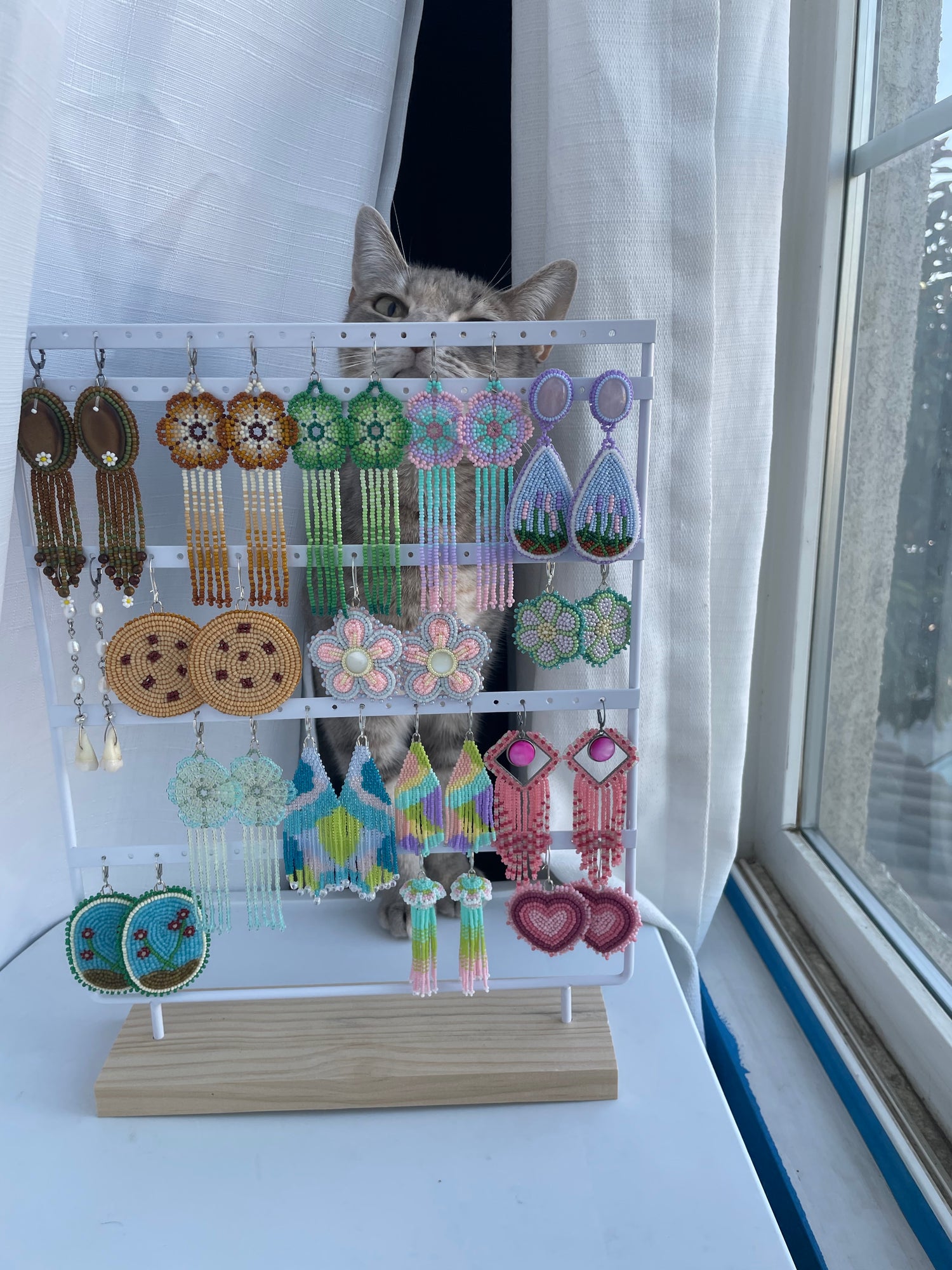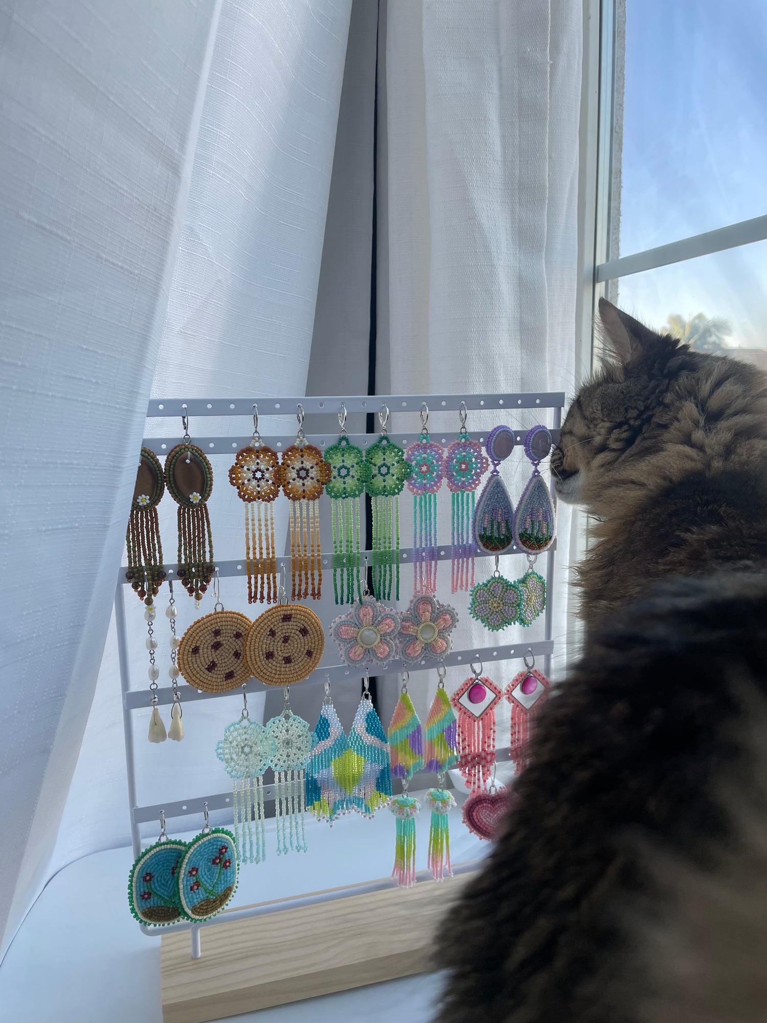I started making beadwork at a time when I was apart from my home and family due to the COVID-19 pandemic and had none of my earrings available to me. During this time, I felt disconnected from my home, family, and culture. I decided to make something of my own and learn to bead the earrings that were so dear to me. Beading has been a wonderful healing journey for me in which I truly found my passion and creative outlet.